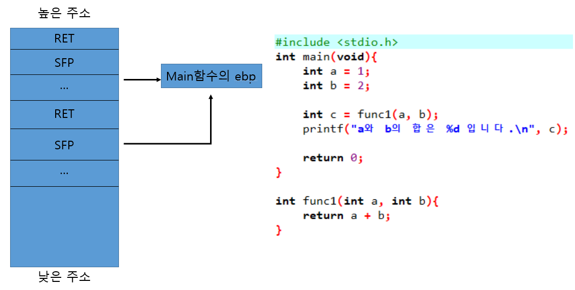 func1함수가 호출되어 스택에 RET이 push되고 SFP가 push될 때 이 SFP는 main함수의 ebp를 가리키게 된다.