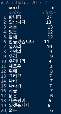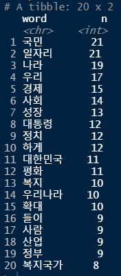 top20 <- head(word_moon, 20) # 상위 20개 단어 추출