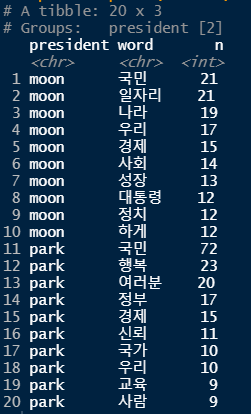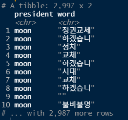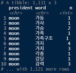 bind_speeches <- bind_rows(moon, park) # 2개의 데이터 합치기(행)