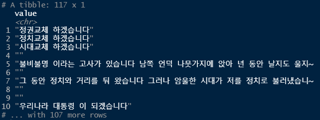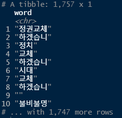 moon <- raw_moon %>% # 한글 외의 문자 제거 및 tibble로 변환