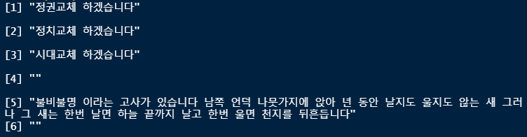 raw_moon <- readLines("speech_moon.txt", encoding="UTF-8") # 파일을 문장단위로 읽어와 raw_moon변수에 저장