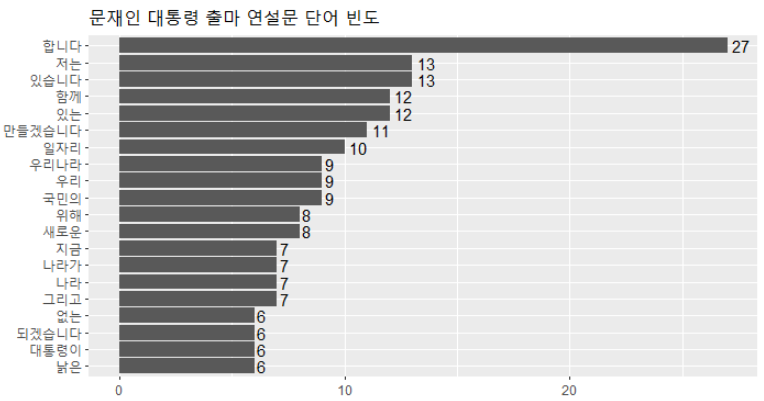 labs(title = "문재인 대통령 출마 연설문 단어 빈도", x = NULL, y = NULL) + # 그래프 제목, x축과 y축 표시 제거