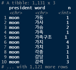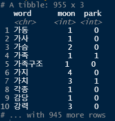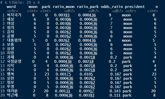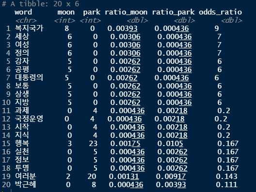 mutate(president = ifelse(odds_ratio > 1, "moon", "park"), # odds_ratio의 값이 1보다 크면 "moon" 크지 않다면 "park"