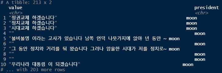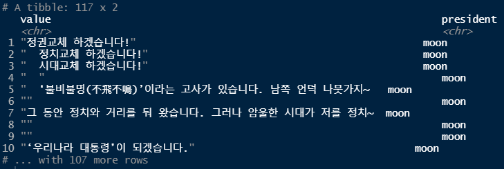 raw_moon <- readLines("speech_moon.txt", encoding="UTF-8") # 해당 파일에서 한문장씩 읽어오기