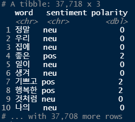 dic <- read_csv("knu_sentiment_lexicon.csv") # 감정사전 csv파일 읽어오기