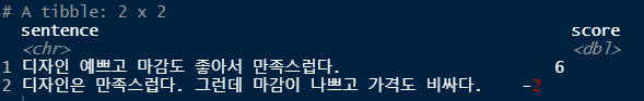 df <- tibble(sentence = c("디자인 예쁘고 마감도 좋아서 만족스럽다.",