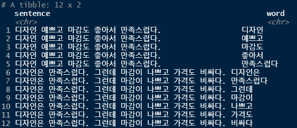unnest_tokens(input=sentence, output=word, token="words", drop=F) # 기존 sentence열을 나두고 word열을 추가
